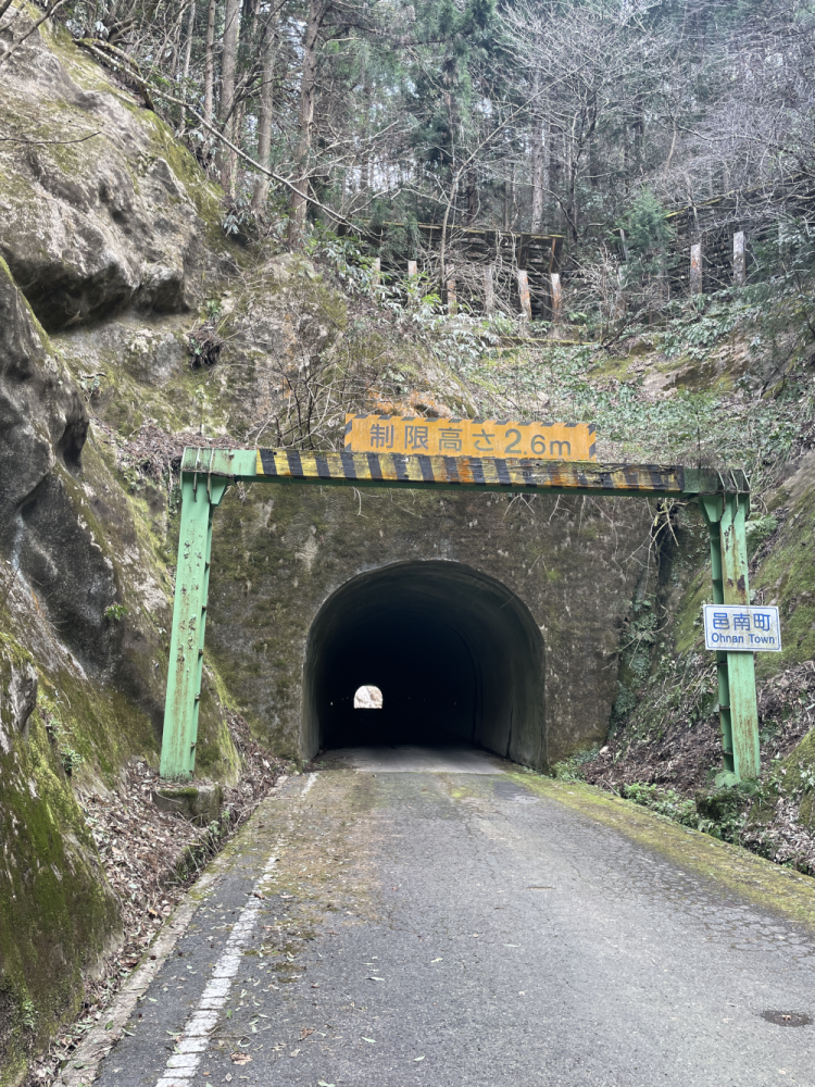 滝からコーナーを1つ2つ曲がると八色石トンネル。トンネルの名前を読み取れるくらいには余裕がある😁