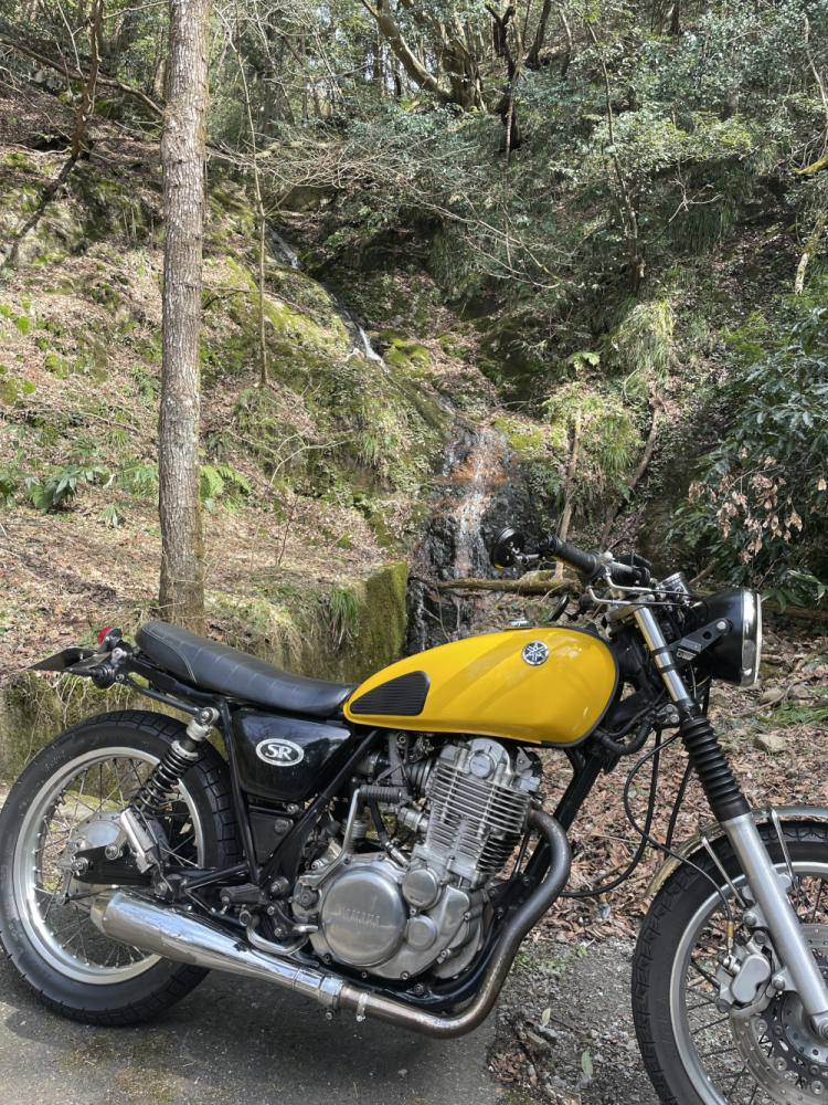 最初に通ったときはひどい山道だ。と思った道だけど、すいすい登っていく。たぶん、こういう狭い山道を走るのに慣れてきたんだろうね。まわりの景色を楽しむ余裕もある。ほとんど登り切る直前で、ちいさな滝を発見😊